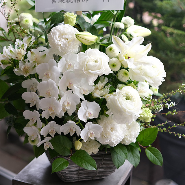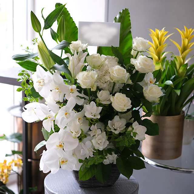開店祝いのお花、就任祝いの花、お供えの花など幅広いご用途に人気のアレンジメントです。アレンジに挿す「立札」や、アレンジに添えてお渡しする「カード」などをご入用の場合は、購入手続き途中の「通信欄」に文面の記入をお願い致します。