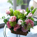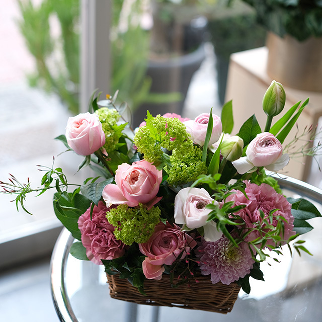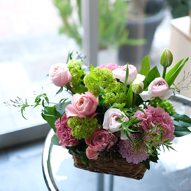 ニュアンスピンクのバスケットフラワーアレンジメントです。ちょっとしたお礼やプレゼントにいかがでしょうか?アレンジに添えてお渡しする「カード」などをご入用の場合は、購入手続き途中の「通信欄」に文面の記入をお願い致します。